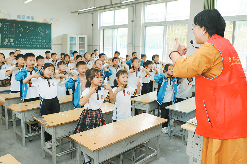 图为辉县市冀屯镇冀祥小学的孩子向新乡文艺志愿者学唱豫剧选段。
