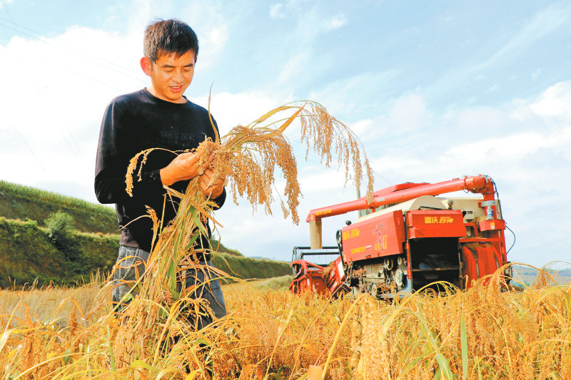 9月22日,在甘肃省平凉市静宁县城川镇咀头村,村民查看糜子生长情况。金秋时节,各地农民在田间地头忙碌,脸上洋溢着丰收的喜悦。