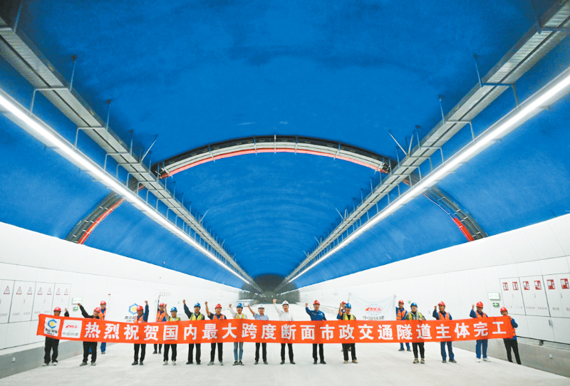 据介绍,该隧道全长1551米,双向双洞8车道,最大开挖跨度31.8米,最大开挖断面447.62平方米,是我国目前最大跨度断面市政交通隧道。