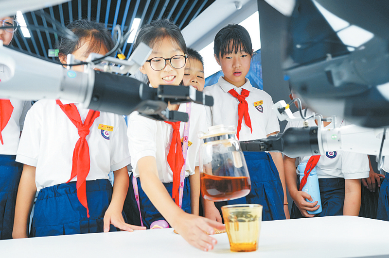 9月23日,浙江绍兴上虞区阳光小学的学生参与扰动实验,让机器人自己寻找杯子倒茶。为探索具身智能机器人在工业场景中的应用,杭州湾具身智能创新中心根据真实作业流程搭建数据采集场景,开展机器人作业模型训练。
