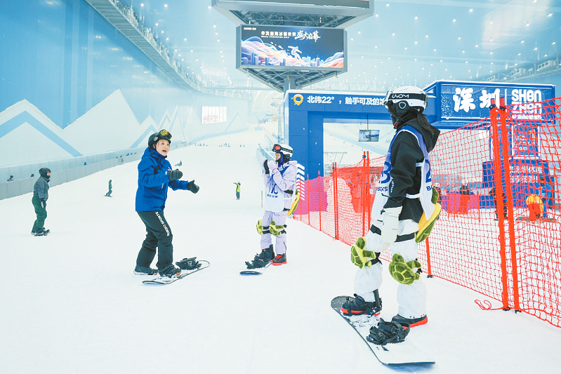 9月29日,在深圳·前海冰雪世界,教练(左)指导学员学习单板。