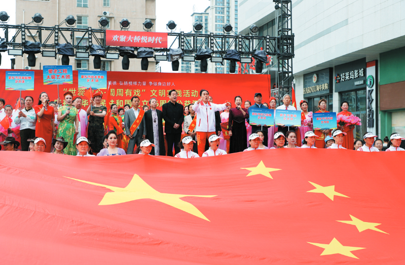 本报讯 (新乡日报全媒体记者李超 文/图)10月1日上午,大桥悦时代购物商场人声鼎沸、喜气洋洋,国庆文艺汇演在此温情举行(如图)。活动由市文明办、新乡道德模范身边好人临时党总支指导,市世蕊爱心团队主办,市和谐友谊艺术团承办,市委市直机关老年文体委、市广场舞协会等单位协办。