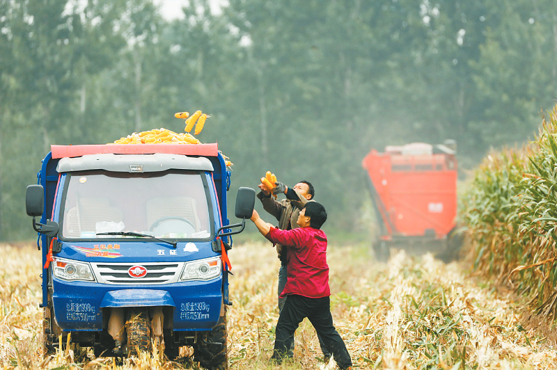 10月11日,在河南省武陟县嘉应观镇一处农田,农民驾驶农机抢收玉米。
