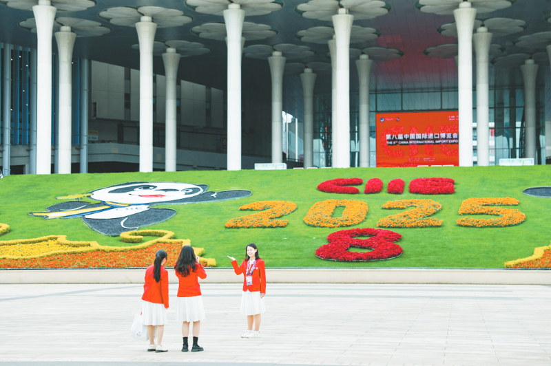 11月4日,志愿者在第八届进博会举办场地——国家会展中心(上海)留影。第八届中国国际进口博览会将于11月5日至10日在上海举行。目前,各项工作准备就绪,静待盛会开幕。 新华社记者王泽聪摄