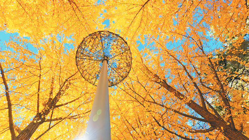 11月2日在北京奥林匹克公园拍摄的银杏林秋景。深秋时节,草木色彩斑斓,与秋水相映成景,在晴空白云下铺展出一幅美丽画卷。新华社发