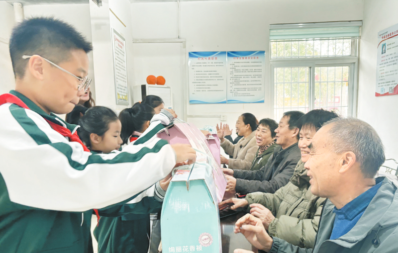 活动中,队员用清脆响快的快板声、整齐划一的手势舞,表达充满童真的感恩与敬爱。表演结束后,少先队员化身“暖心小天使”,走到老教师身边,轻轻为他们捶捶背、揉揉肩,用稚嫩的小手传递温暖,用暖心的话语送上问候,现场笑声与暖意交织,汇成最动人的画面。少先队员还深入社区,为老人献上精彩节目,赢得阵阵掌声,用实际行动传承了敬老爱老的传统美德。