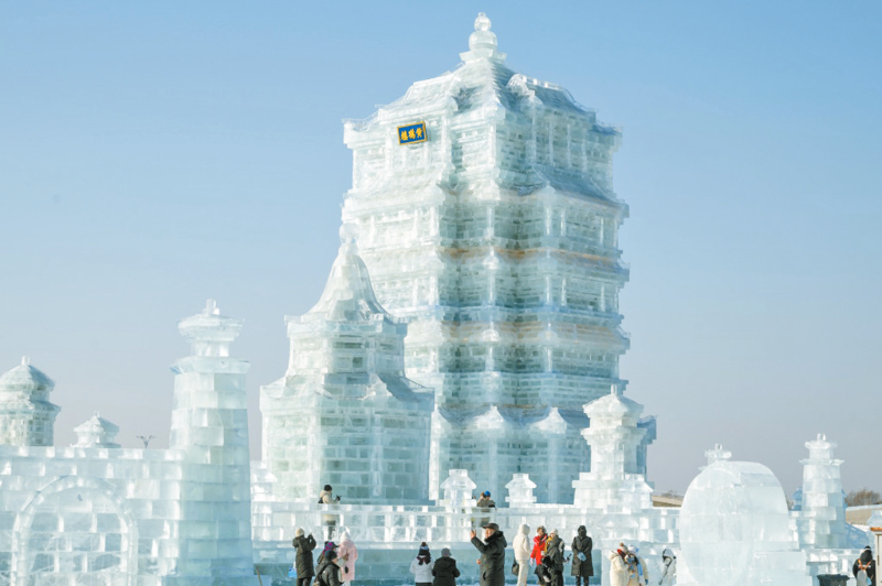 12月17日,游客在哈尔滨冰雪大世界园区游玩。当日10时,第二十七届哈尔滨冰雪大世界正式开园迎客。园区占地面积达120万平方米,总用冰用雪量突破40万立方米,以历届之最的规模,打造一座冰天雪地的“童话世界”。