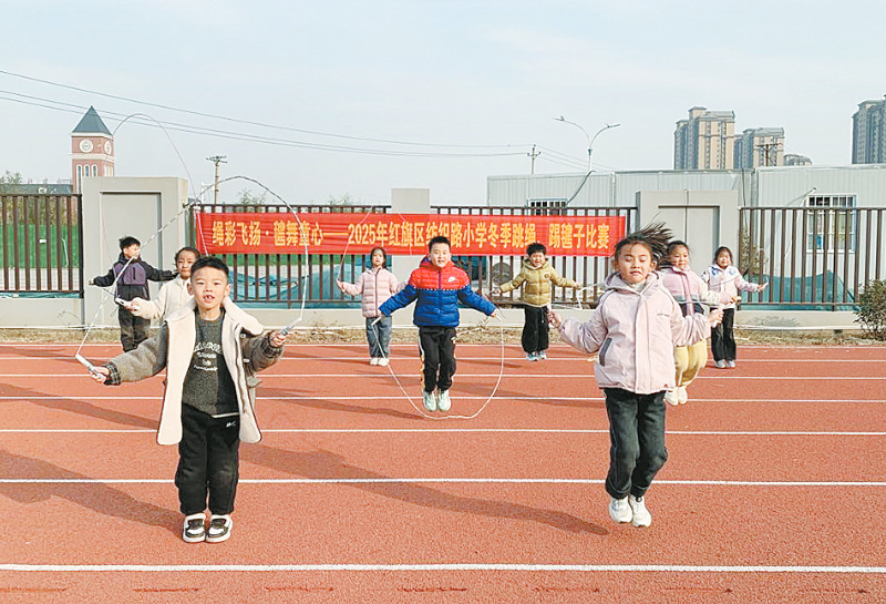 本报讯 12月8日,红旗区纺织路小学举行“绳彩飞扬·毽舞童心”冬季跳绳、踢毽子比赛(如图)。师生同场竞技,共展运动风采。