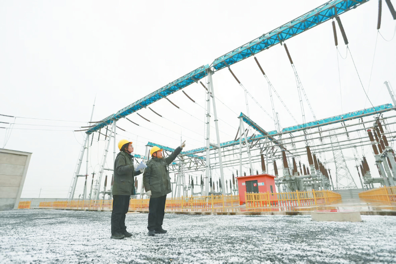 近日,获嘉县供电公司各专业员工顶雪巡视供电线路和设备,及时消除安全隐患,全力保障电网稳定运行,守护千家万户用电安全。图为该公司变电运行员工在220千伏帅庄变电站内巡视电力设备。