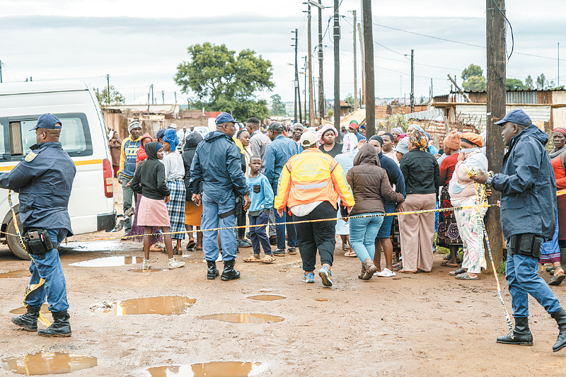 12月21日,在南非贝克斯达尔镇,警方封锁枪击事件现场附近街道。南非警方21日说,南非最大城市约翰内斯堡附近贝克斯达尔镇发生枪击事件,已导致至少10人死亡、10人受伤。 新华社发(希拉兹·穆罕默德 摄)