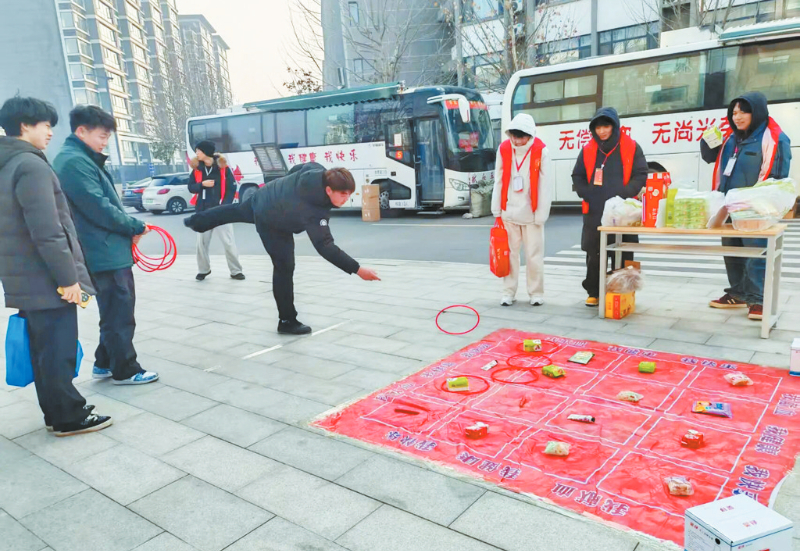 为了让采血现场氛围更加轻松愉快,新乡市中心血站的工作人员还精心策划了一场“暖心互动”活动。献血车下,套圈游戏笑声连连(如图),无偿献血知识有奖问答热火朝天。学生们在欢声笑语中巩固了无偿献血知识和献血注意事项。