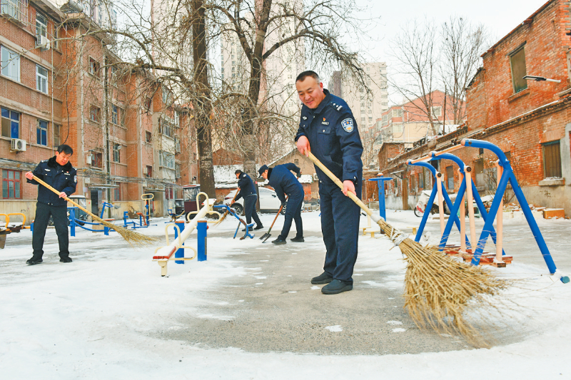 1月20日,市公安局卫滨分局健康路派出所组织民警到辖区某小区清扫积雪,方便群众安全出行。