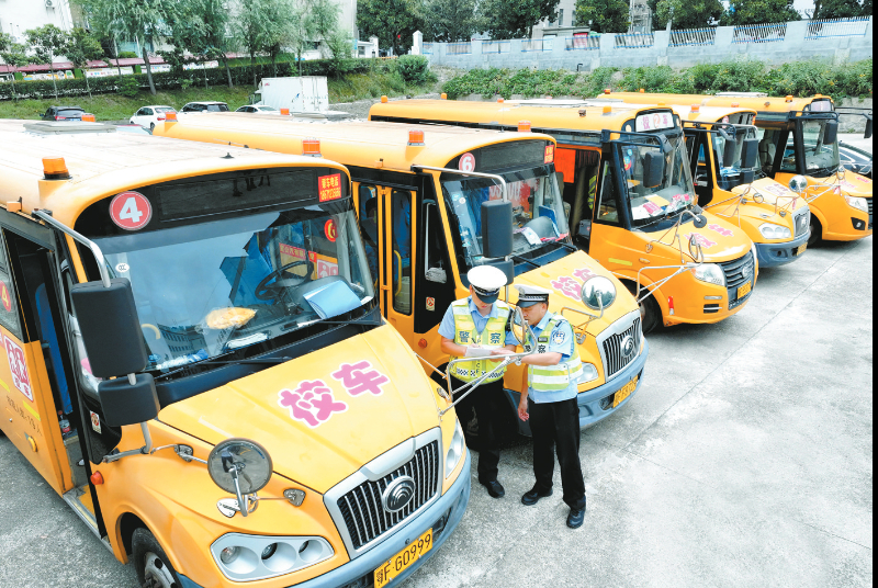 8月25日,湖北省襄阳市保康县公安局交警大队民警对校车进行安全检查(无人机照片)。