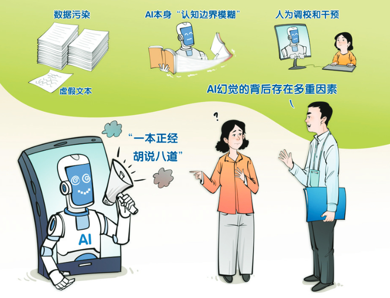 当前,AI正赋能千行百业,为人们的工作、学习、生活带来极大便利。与此同时,不少人发现,用AI搜索数据,给出的内容查无实据;用AI辅助诊疗,出现误判干扰正常治疗......AI频频上演“一本正经胡说八道”。社交平台上,AI幻觉引发热议。 新华社发 曹一 作