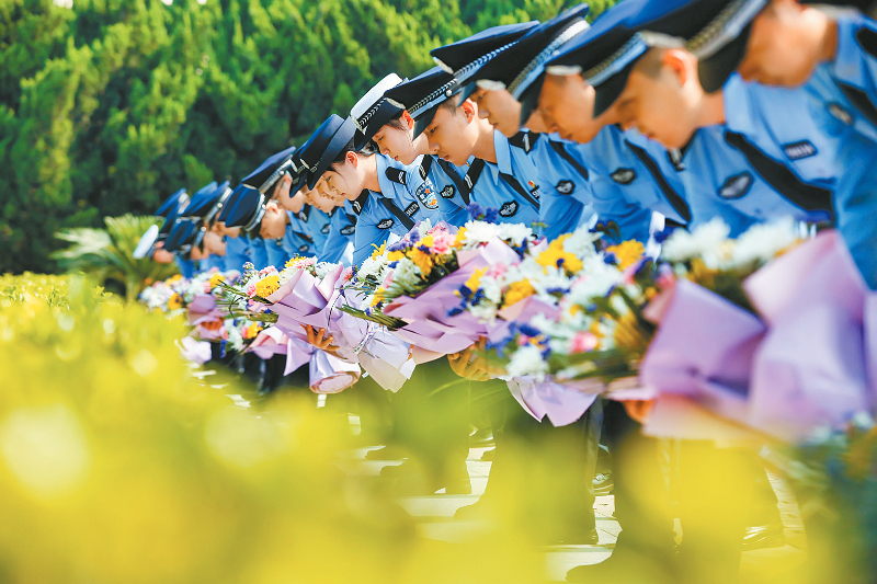 9月30日,民警在天津市滨海新区塘沽烈士陵园献花。2025年9月30日是第十二个烈士纪念日,各地举行纪念活动,缅怀革命先烈,传承红色信仰。 新华社发