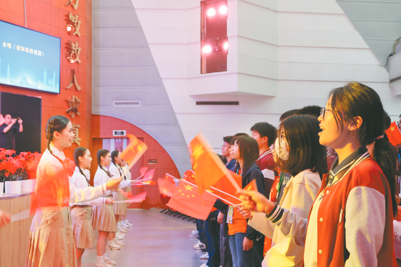 10月14日,香港金文泰中学师生与重庆市育才中学校师生合唱《我和我的祖国》。 新华社记者 雷明宇 摄
