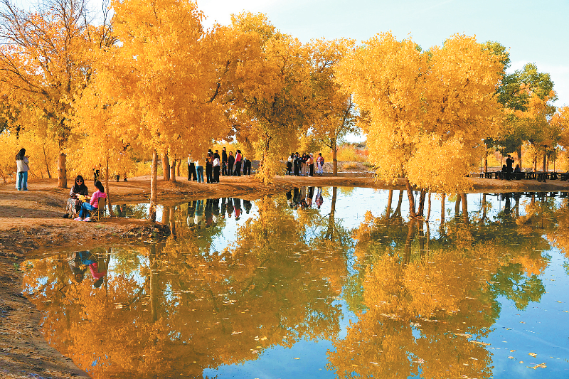 金秋十月,甘肃敦煌多地胡杨林被秋色渲染,吸引游客前来赏景打卡拍照。新华社发(张晓亮摄)