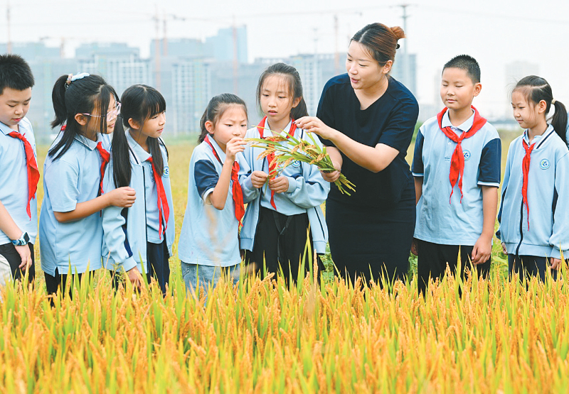10月15日,江苏省太仓市港城小学老师为孩子们讲解水稻生长知识。10月16日是第45个世界粮食日,多地学校开展爱粮惜粮教育活动。今年世界粮食日的主题为“手拉手共倡多样美食,聚合力同创美好未来”。