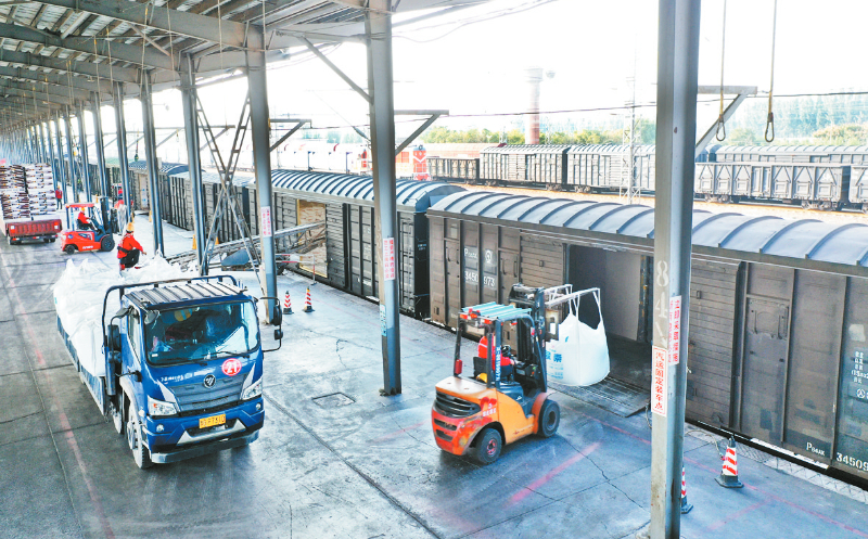 化肥作为农业生产的基石,是保障粮食安全的重要农资。当前,我市小麦播种即将大面积展开,田间用肥需求量持续攀升。近日,作为我省化肥生产的龙头企业,河南心连心化学工业集团股份有限公司正开足马力保障市场化肥供应。图为该公司铁路专运线上的工作人员正在装运化肥。 李青春 摄