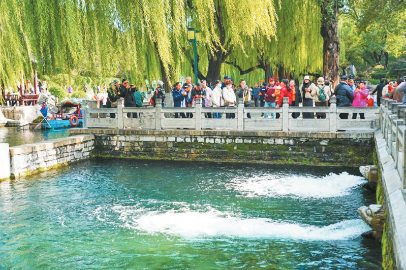 10月22日,人们在济南泉水绿道步行观看泉水景观。近日,山东省济南市泉水喷涌有力,吸引了众多市民和游客到泉水绿道行走,观赏泉水景观。济南市泉水绿道总长约6.6公里,沿护城河和大明湖公园而建,串联起多个泉水景观和名胜古迹。 新华社记者徐速绘摄