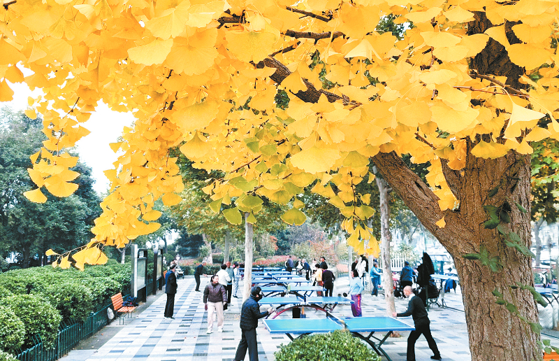 近期气温较低,银杏树叶逐渐变黄,金黄的银杏叶摇曳生姿,显得格外美丽。我市牧野文化广场上已是金黄的银杏树吸引许多市民前来观赏,大家在美丽的环境中打球、玩乐,幸福生活溢于言表。