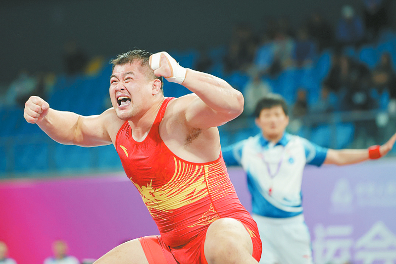 11月13日,山东队选手孟令哲在赛后庆祝夺冠。当日,第十五届全国运动会摔跤男子古典式130公斤级比赛在广东清远举行。