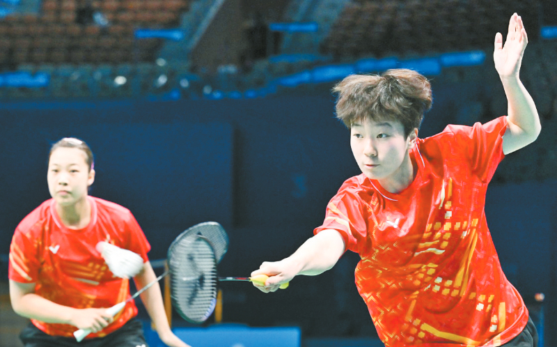11月13日,江苏队组合秦添悦/史思宸(右)在女双比赛中。她们2比1战胜广东队组合。当日,在深圳进行的第十五届全国运动会羽毛球18岁以下女子团体决赛中,江苏队3比1战胜广东队,夺得冠军。 新华社记者 李贺 摄