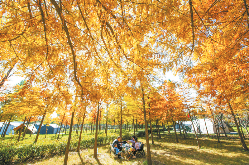11 月 15日,市民在河南省洛阳市伊滨区伊水游园内赏景休闲。农历九月正值深秋时节,草木变了颜色,大自然把最绚烂的色彩留给了这个季节。略带寒意的秋风中,飞舞的各色落叶是此时最浪漫的景致。明朝孙承恩在《九月》一诗中,用“天上繁霜降,人间秋色深”点明此时季节特点。