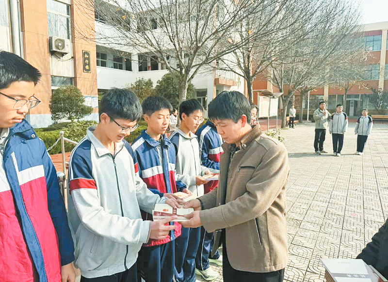 活动中,身为凤翔中学法治副校长的郑跃标,以寓言故事《南辕北辙》为切入点,向同学们强调树立正确道德观念和价值标准的重要性,让大家深刻理解“若人生方向偏离,前行越快则离目标越远”的道理。随后,他通过引用《弟子规》中的经典语句开展道德教育,以简洁易懂、朗朗上口的诗句形式,帮助同学们快速理解内容核心。最后,郑跃标结合法律条文,系统阐释了校园欺凌的定义、常见类型及法律后果,引导学生树立“行为有底线、违法必受罚”的法治意识。活动尾声,郑跃标向学生代表逐一发放《中华人民共和国民法典》宣传手册(如图)。