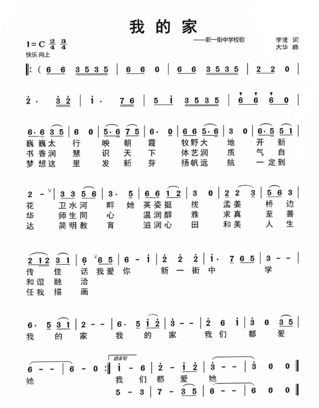 高新区新一街中学是一所2019年成立的九年一贯制公办学校。为加强校园文化建设,营造良好的校园人文环境和氛围,进一步增强广大师生的责任感、使命感和向心力,促进教育教学高质量发展,学校于2022年5月由李波老师执笔,融集体智慧,创作了富有时代气息和学校特色的校歌歌词——《我的家》。随后,学校邀请中国音乐家协会成员、新乡市著名作曲家胡大华老师为校歌谱曲。至此,高新区新一街中学校歌正式诞生。