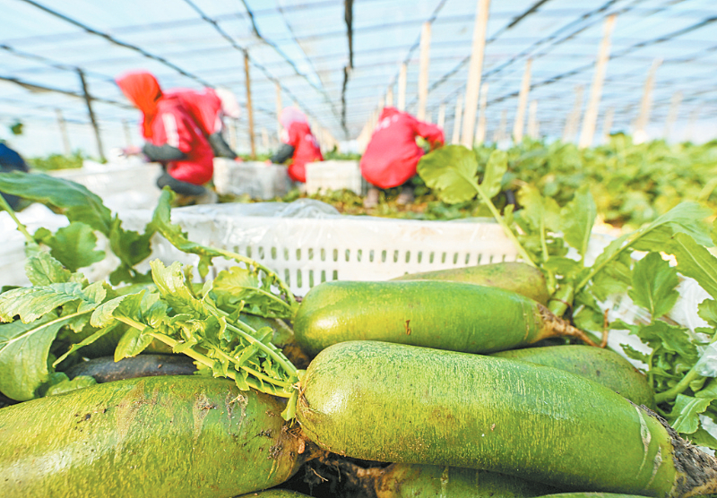 11月20日,在天津市西青区辛口镇种植沙窝萝卜的大棚内,农民在采摘萝卜。时下,天津市西青区辛口镇的沙窝萝卜进入采收期。当地农民有序开展采收、包装、发货等工作。 新华社记者赵子硕摄