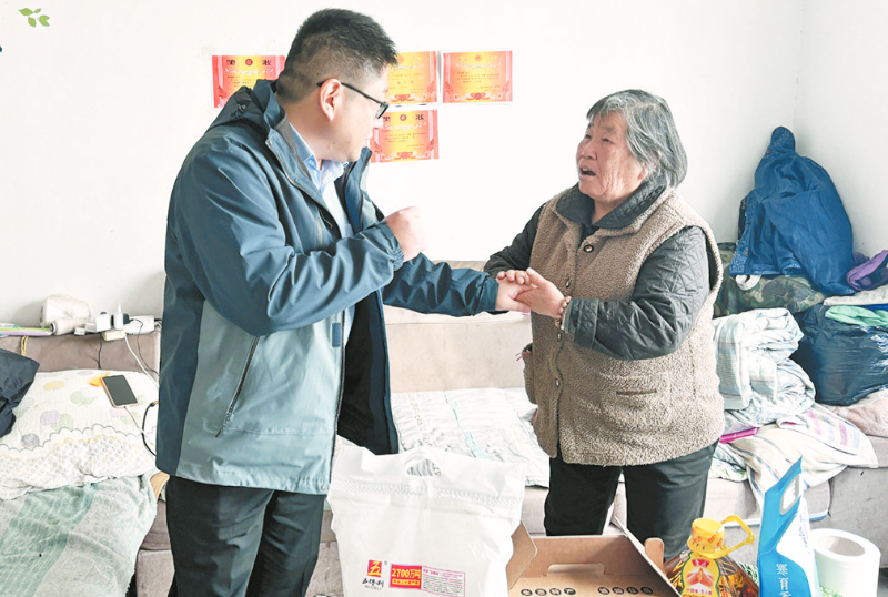 活动现场,志愿者与老人们促膝长谈,仔细询问老人们的身体状况、生活需求及实际困难,耐心倾听他们的心声,叮嘱老人注意居家安全和冬季保暖,并送上了米面油、生活用品等慰问物资。空巢老人王阿姨紧紧握着该支公司负责人的手说:“你们能常来看看比啥都强,心里真是太温暖了(如图)。”