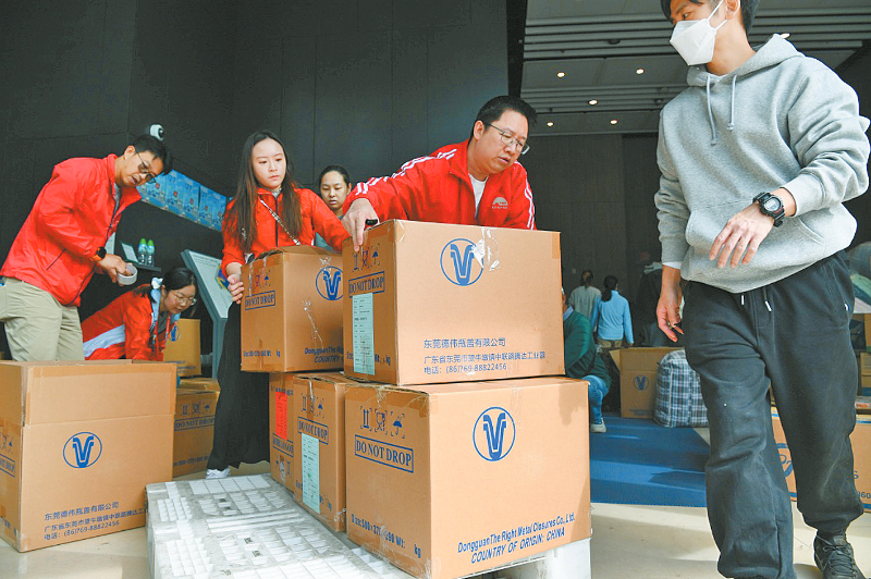 11月27日,在香港大埔东昌街社区,工作人员搬运市民捐赠的物资。