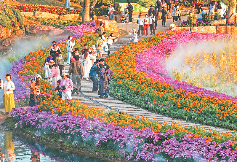 游客在广西南宁市青秀山风景区丘石花园赏花(11月26日摄,无人机照片)。连日来,广西南宁市迎来晴好天气。冬日暖阳下,南宁市青秀山风景区丘石花园内盛开的鲜花格外艳丽。