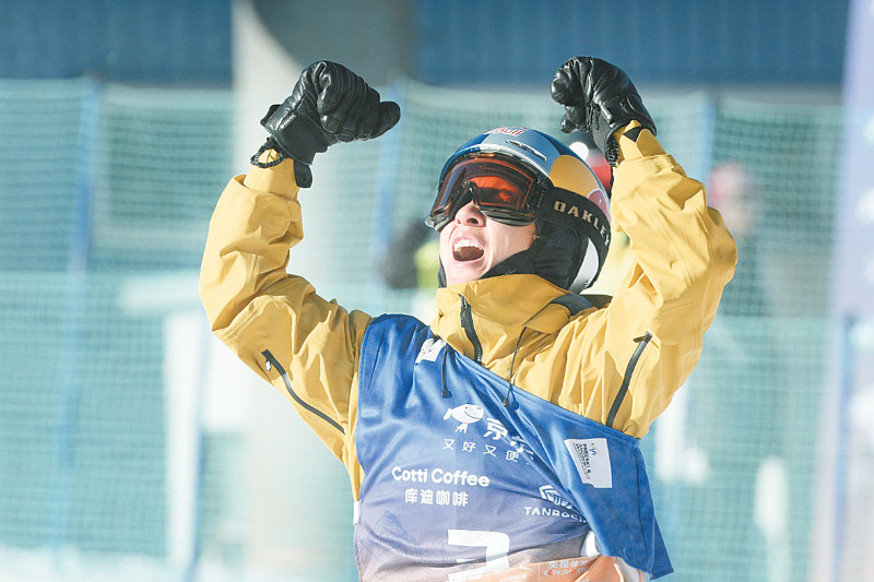11月27日,中国选手苏翊鸣在单板滑雪男子大跳台资格赛中庆祝晋级。当日,国际雪联单板滑雪大跳台世界杯赛季揭幕战资格赛在河北张家口市崇礼区云顶滑雪场举行。 新华社记者 卢星吉 摄