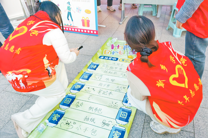 为了让大学生更好地了解艾防知识,活动还设置了一系列互动游戏。图为大学生志愿者在布置游戏现场。