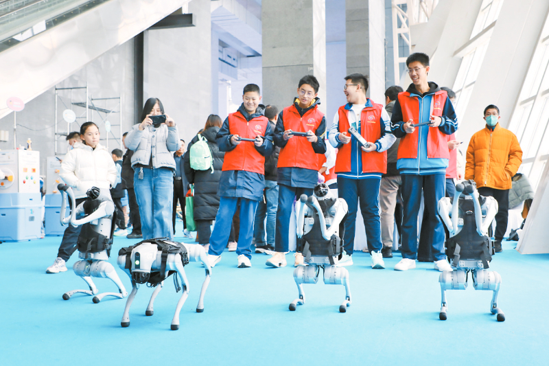 图为在第七届高校院所河南科技成果博览会上,中学生操作机器狗。