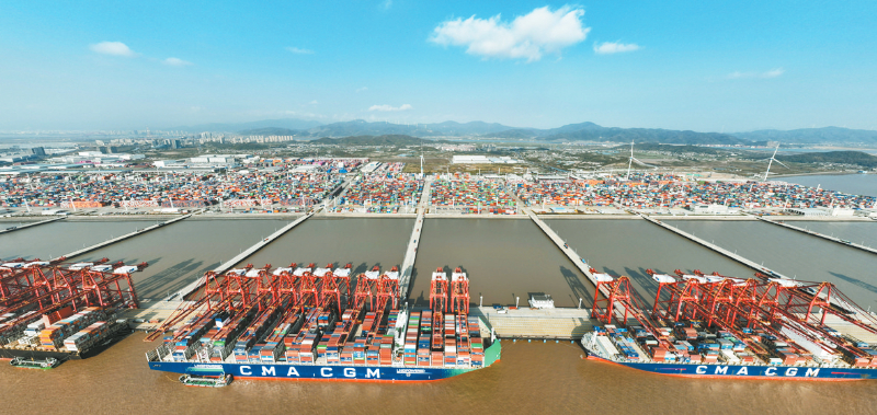12月2日,船舶停靠在宁波舟山港梅山港区装卸货物。12月2日,宁波舟山港2025年集装箱吞吐量突破4000万标准箱。宁波舟山港近年来发展不断提速,货物吞吐量已连续16年蝉联全球第一,在共建“一带一路”、长江经济带发展、长三角一体化发展等国家战略中发挥出重要作用。 新华社记者翁忻旸摄