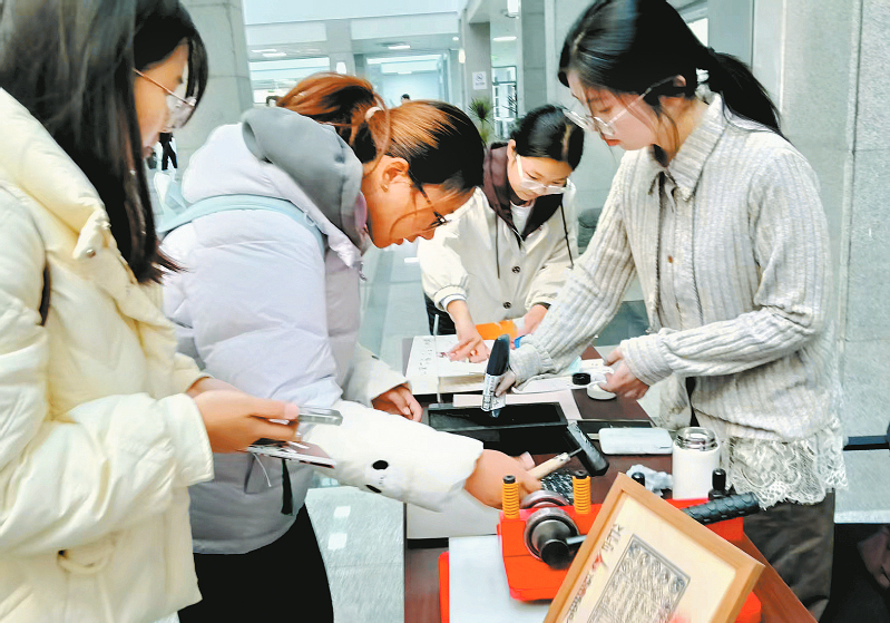 12月7日,河南师范大学图书与档案信息中心联合郑州市黄淮艺术博物馆等14家博物馆,举办“青春遇见博物馆——博物馆主题文化联展走进大学”活动,以每家博物馆主题文化为依托,融知识性、互动性与趣味性为一体,深受大学生的青睐。图为学生在沉浸式体验博物馆文物。