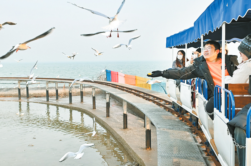 游人乘坐小火车喂食海鸥(12月10日摄)。冬日,在天津市滨海新区的海贝乐园,成群的海鸥在此聚集栖息,吸引众多游人前来喂食、赏趣。 新华社记者 李然 摄