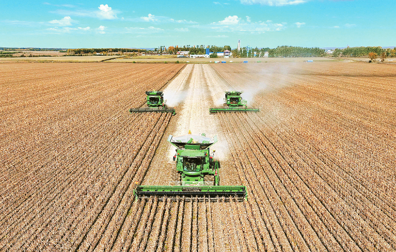 9月29日,在北大荒集团黑龙江尾山农场有限公司第一管理区,农机进行大豆收获作业。12月12日,国家统计局发布数据显示,2025年,全国粮食产量14297.5亿斤,比上年增加167.5亿斤,增长1.2%,稳定在1.4万亿斤以上,全国粮食实现丰收。 新华社发