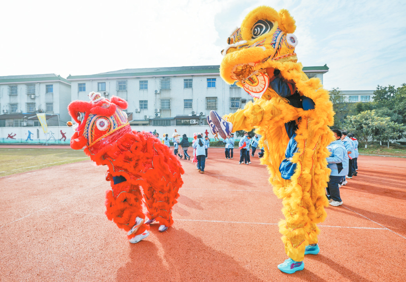 12 月 16日,轧村中学的学生们在阳光大课间活动中进行舞龙训练。近年来,浙江省湖州市织里镇轧村中学为推动学生综合素质全面提升,着力打造特色阳光大课间活动,以“练习+比赛”为主要形式,涵盖武术、舞狮等传统文化活动项目和各类现代球类运动。