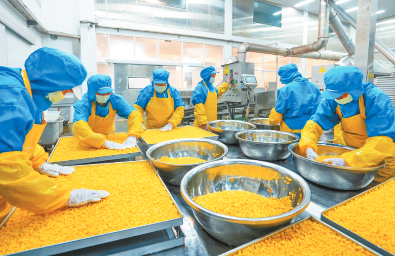 12月16日,工人在江苏省兴化市垛田街道顶能科技有限公司生产车间加工冻干玉米。 时值年末,各企业铆足干劲,加紧生产,力保完成全年生产任务。 新华社发