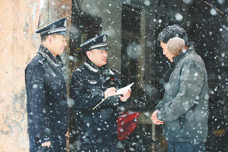入冬以来,市公安局卫滨分局心系群众冷暖,组织民警深入居民家中开展“大走访”活动,了解民情,排查安全隐患,叮嘱居民增强冬季消防安全意识,防范取暖用电、用气可能带来的风险。图为12月12日,铁西派出所民警冒着大雪深入群众家中走访。