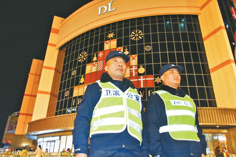 元旦假期期间,市公安局卫滨分局坚持科学用警、合理布警,组织警力在辖区主要路段、商超积极开展武装巡逻。图为民警在胖东来生活广场定点值守,全力保障群众购物安全。 吕永强 摄