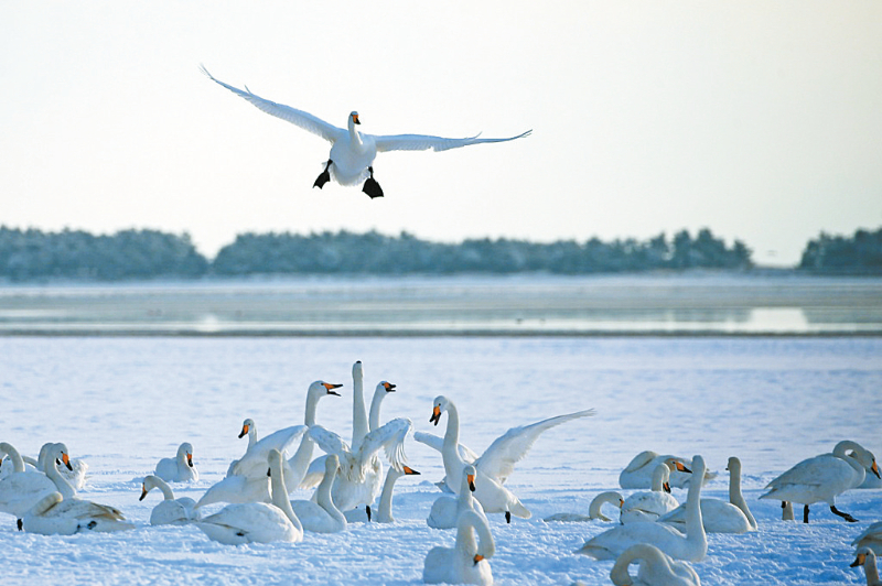 1月11日,在山东省荣成市天鹅湖,大天鹅在积雪的湖畔休憩。