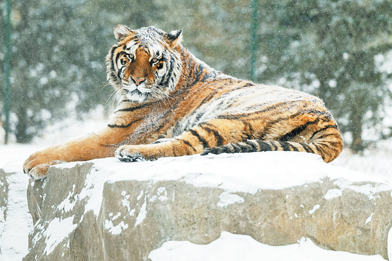 1月12日,冰城哈尔滨市迎来降雪天气,在黑龙江东北虎林园,散放区的东北虎在雪地活动。 新华社记者 张涛 摄