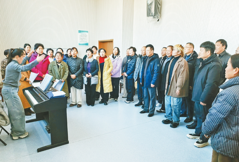 1月6日,封丘县文化馆内乐声悠扬,数十位银发歌者齐聚排练厅,神情专注地进行合唱排练(如图)。随着指挥手势的起伏,四个声部交织出立体丰满的和声,将《朝阳沟》中那段亲切质朴的对话,演绎成一部富有层次感的音乐画卷。
