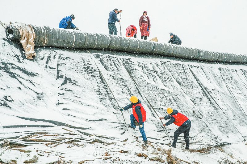1月19日,在河南省焦作市博爱县孝敬镇博爱源蔬菜专业合作社,辖区供电职工帮助菜农对蔬菜大棚保暖棉被进行维护。