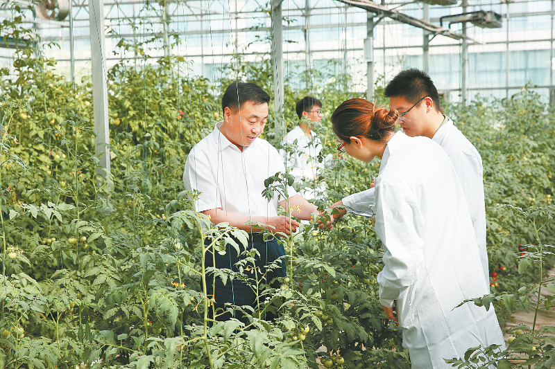 张庆金(左一)在智能温室大棚调研腐植酸高效肥研发进展情况
